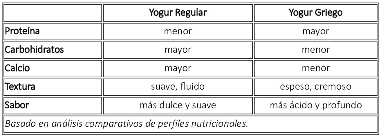 Nota: un yogur griego contiene casi el doble de proteína que un yogur tradicional, con menos azúcar y carbohidratos, mientras que el yogur tradicional contiene un poco más de calcio debido a la menor eliminación de suero.
