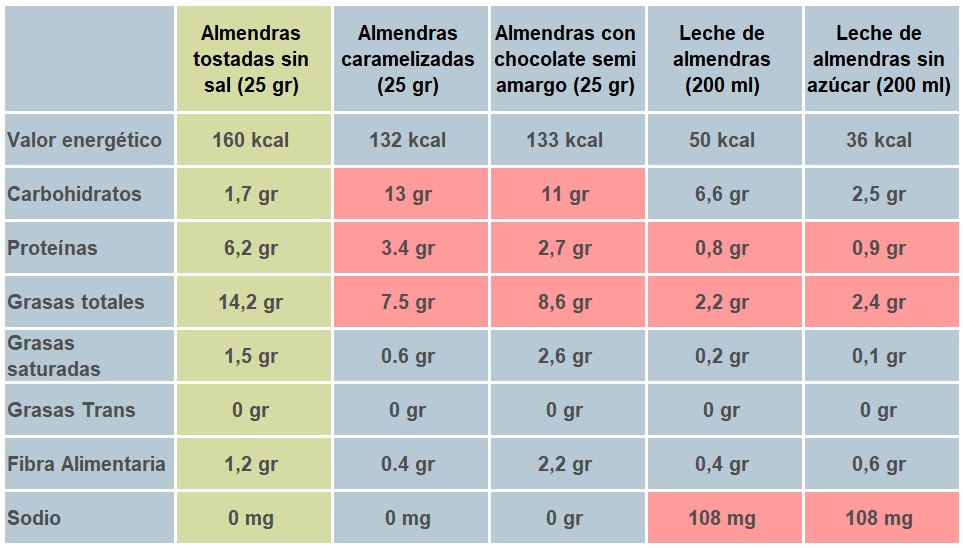 Si comparamos la almendra sin agregados (tostada sin sal) con otros formas de presentación vemos que cambia bastante su composición. Por ejemplo, si la consumimos sola tiene un gran aporte de proteínas (25 gr de almendras tienen 6,2 gr de proteínas) pero al consumir la leche de almendras, este aporte disminuye notoriamente (200 cc de leche de almendras aporta tan solo 0,8 gr de proteínas) lo cual hace que la leche de almendras no sea una buena opción si lo que queremos es consumir proteínas. A su vez se ve incrementado el aporte de sodio lo cual no es propio de las almendras en su estado natural.