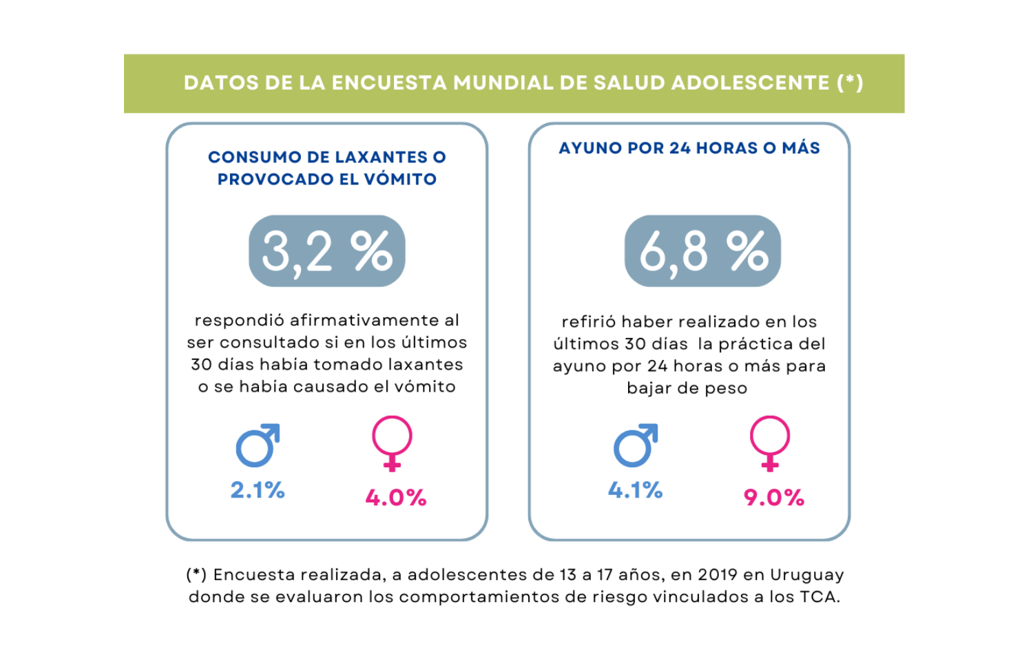 Uruguay, como muchos otros países, no dispone de datos sobre la prevalencia de los TCA debido a la dificultad para recabar los datos debido a las diferentes formas de presentación y evolución. A nivel global, se estima una prevalencia aproximada del 8% en mujeres y del 2% en hombres para los TCA más comunes.