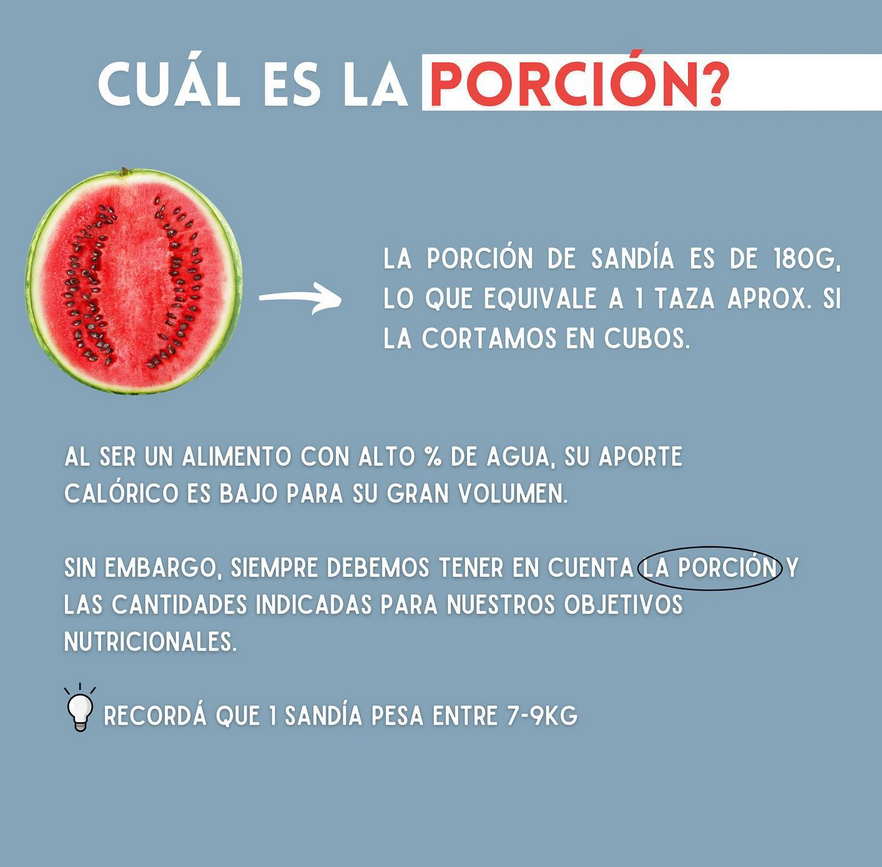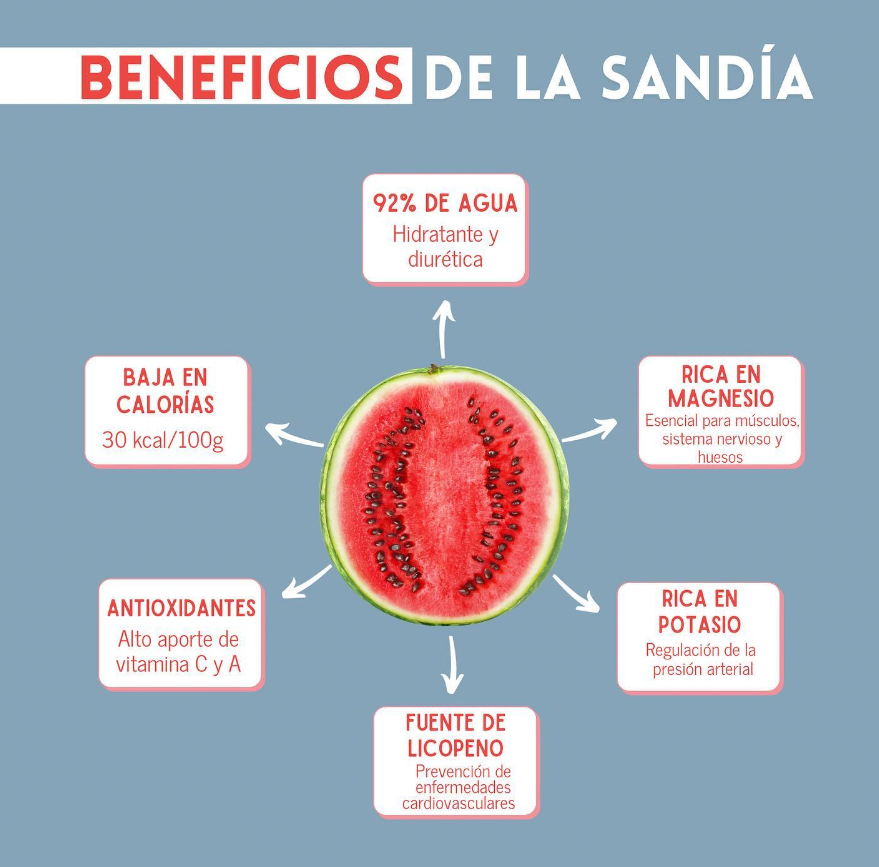 💡Cómo te contamos, la sandia tiene un alto aporte de Licopeno, un pigmento orgánico que le da el color rojo a la sandía. Tiene poder antioxidante y es muy estudiado por sus efectos sobre la prevención de enfermedades cardiovasculares y cáncer, entre otros.